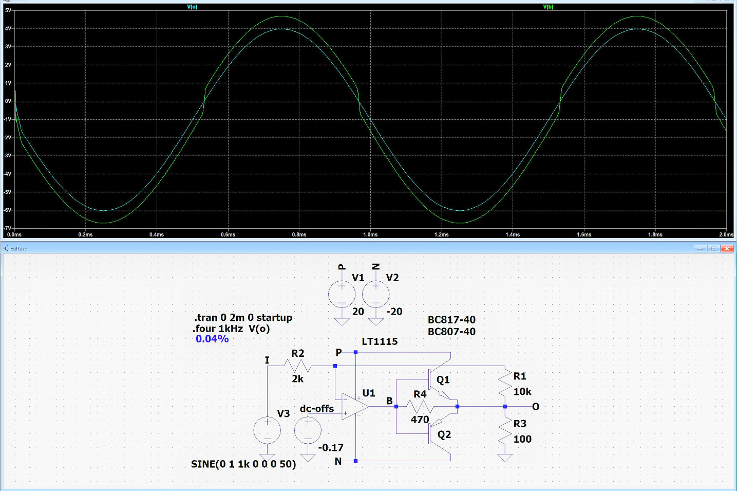 Die vorstehende Schaltung zeigt die einfachste Gegentakt-Pufferstufe für einen Operationsverstärker. Es wurde im Interesse von Einfachheit auf einen Ruhestrom verzichtet. In den meisten Fällen ist eine solche Lösung mehr als ausreichend. Diese Schaltung hat einen Klirrfaktor von 0,04 % bei 1 kHz. Das ist fast immer voll zufriedenstellend. Das Signal (grün) an den parallel geschalteten Basen überschreitet schnell die beiden B-E-Spannungen von insgesamt etwa 1,4 V. Am Plus-Eingang des OPV ist ein Offset von -0,17 V eingestellt. Das ergibt eine Verschiebung der Ausgangsspannung 'O' um -1 V, weil die Verstärkung vom Plus-Eingang aus 6 beträgt (R1/R2+1), wohingegen die Verstärkung für den Eingang 'I' 5 beträgt (R1/R2).