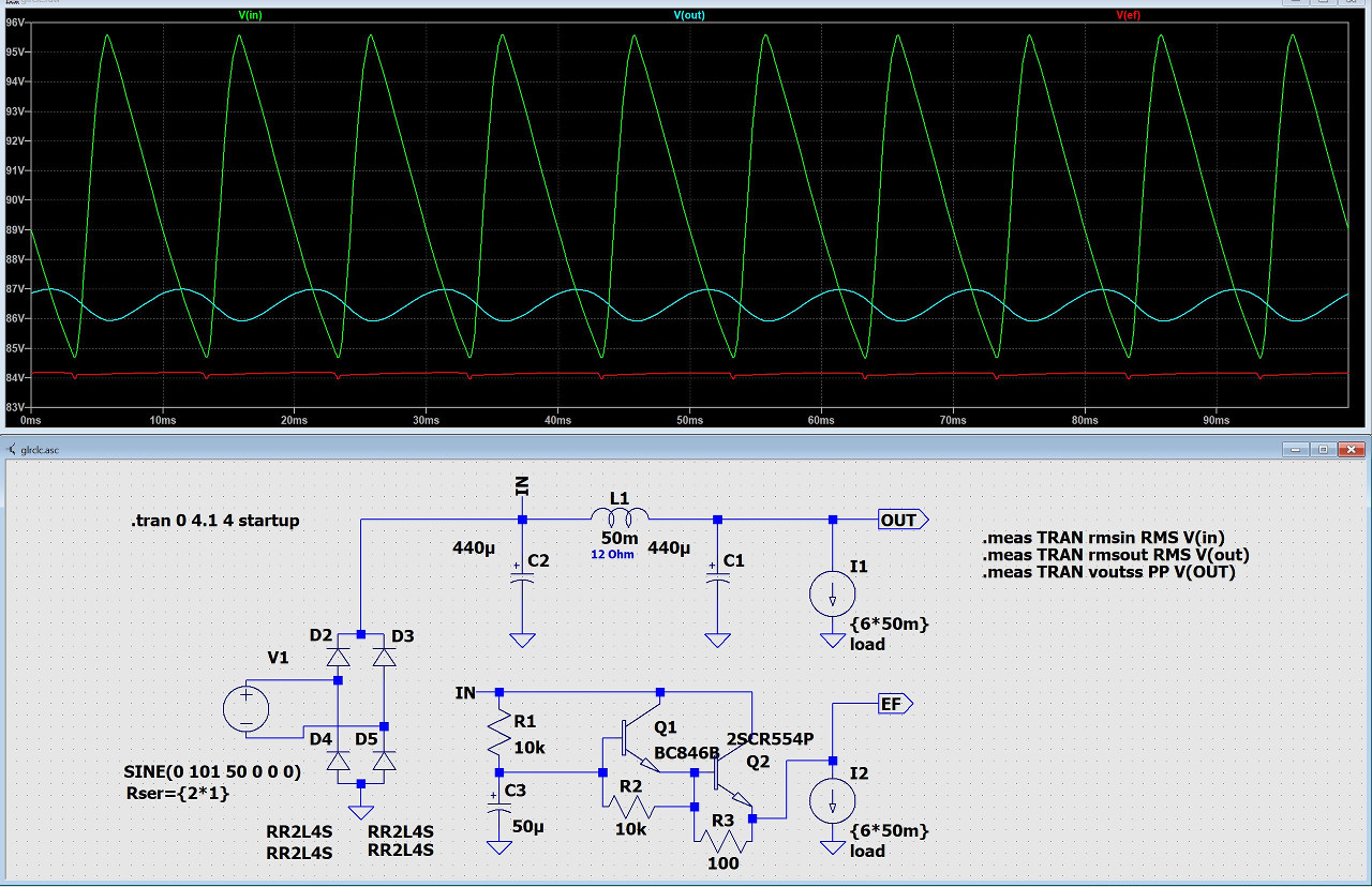 Die Schaltung unten ist ein RC-Glied mit nachfolgendem Darlington-Transistor als Emitterfolger geschaltet (3 Bauelemente). Diese auf einem Halbleiter-Bauelement basierende Schaltung ist der oberen Schaltung mit Elko+Drossel+Elko weit überlegen, wie der Graph der Ausgangsspannung V(ef) zeigt. Sie ist einfach intelligenter. Da Drossel L1 und Elko C1 entfallen, ist sie zudem kleiner, leichter und verursacht geringere Kosten.