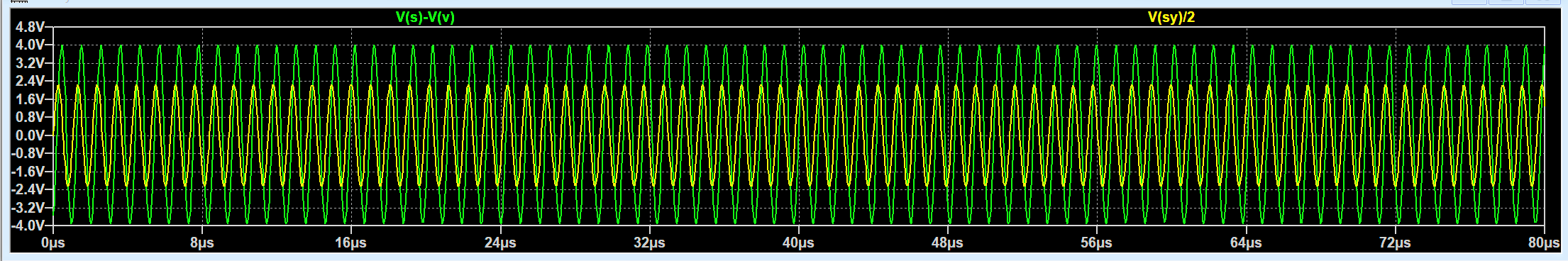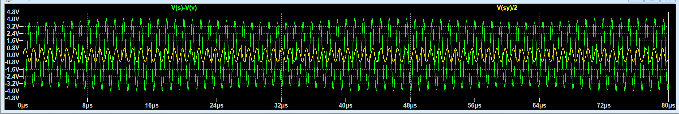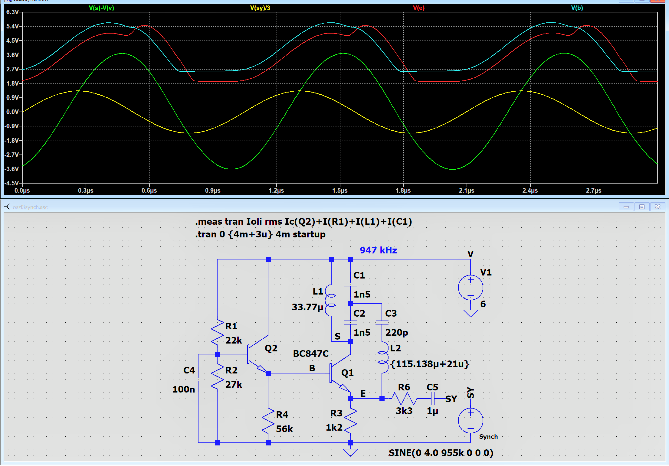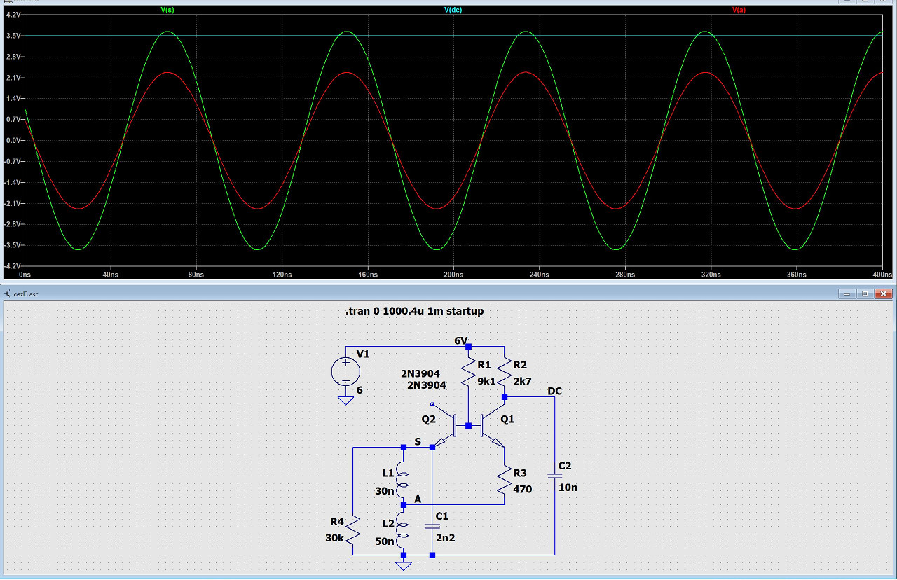 Die Induktivitäten L1 und L2 in der LTspice-Simulation bilden gemeinsam mit C1 einen Transformator, der vom Emitterfolger Q1 gespeist wird, der ja ohne Transformator eine Spannungsverstärkung von < 1 hat und damit nicht schwingen kann. Die Spannungen V(a) und V(s) zeigen die transformatorische Wirkung. Die Induktivitäten im realen Ferrit-Kern haben auch eine magnetische Kopplung über den Ferrit-Kern.