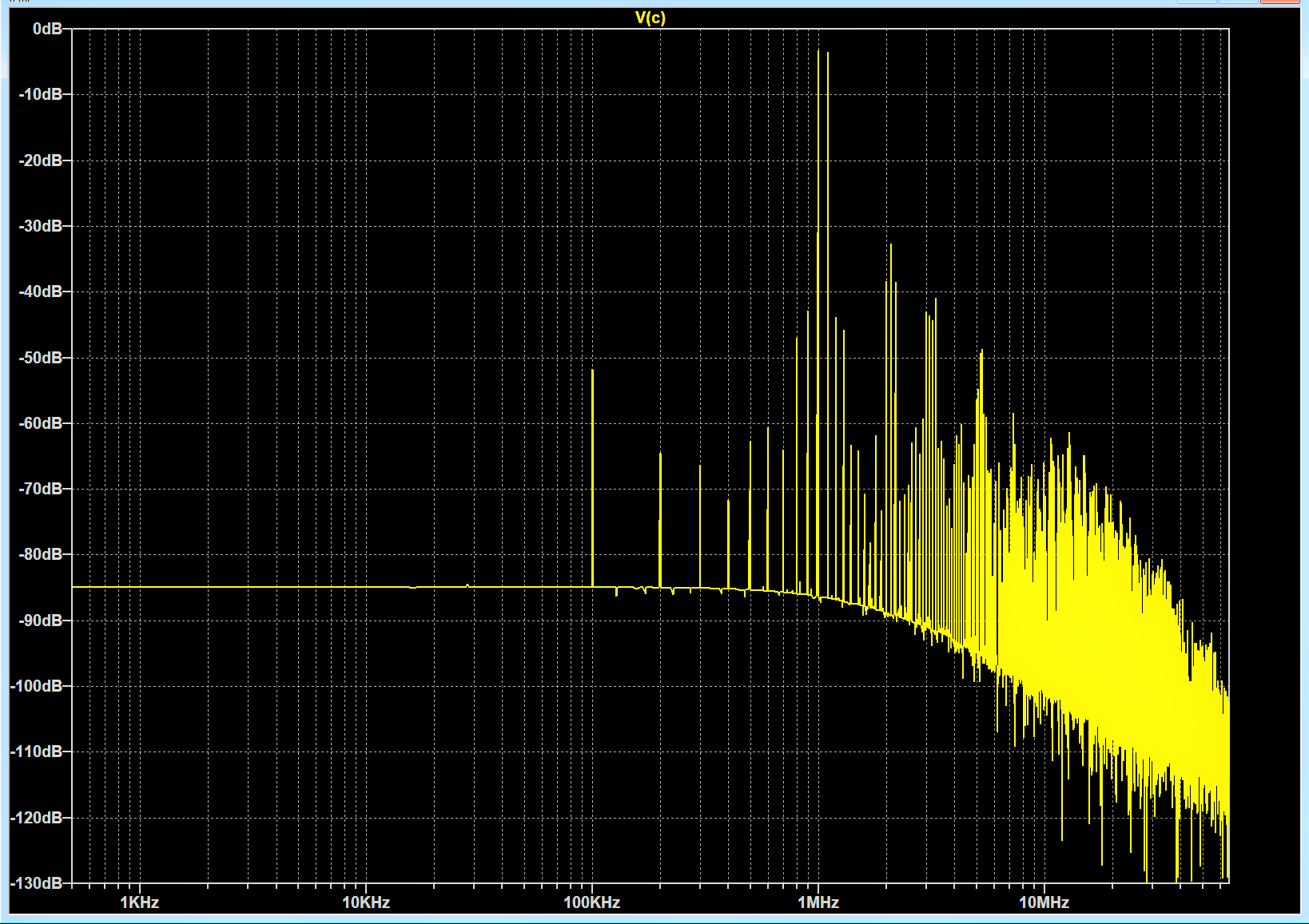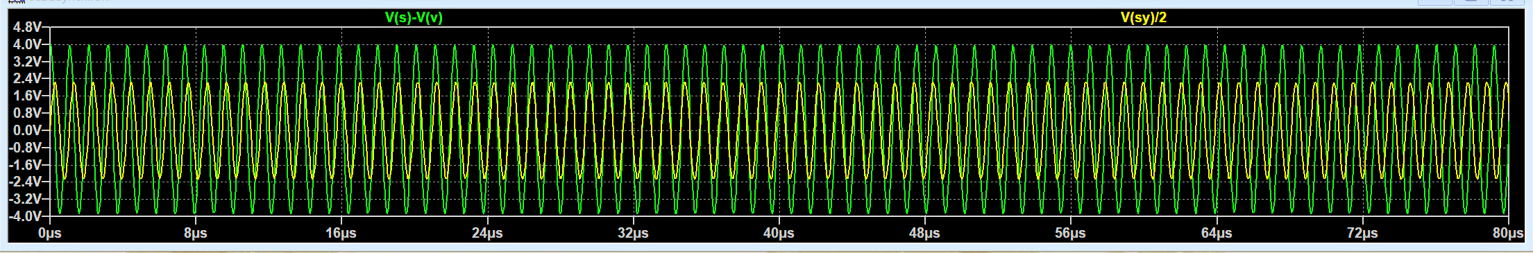 Die Grundfrequenz frei laufend beträgt 947 kHz, die Sync-Frequenz 955 kHz. Für die Hüllkurve wurde die Sync-Frequenz auf 975 kHz erhöht, damit mehr als eine Periode der Hüllkurve sichtbar ist. Bei gleichen Frequenzen ist die Frequenz der Hüllkurve = 0, deren Amplitude ebenso.