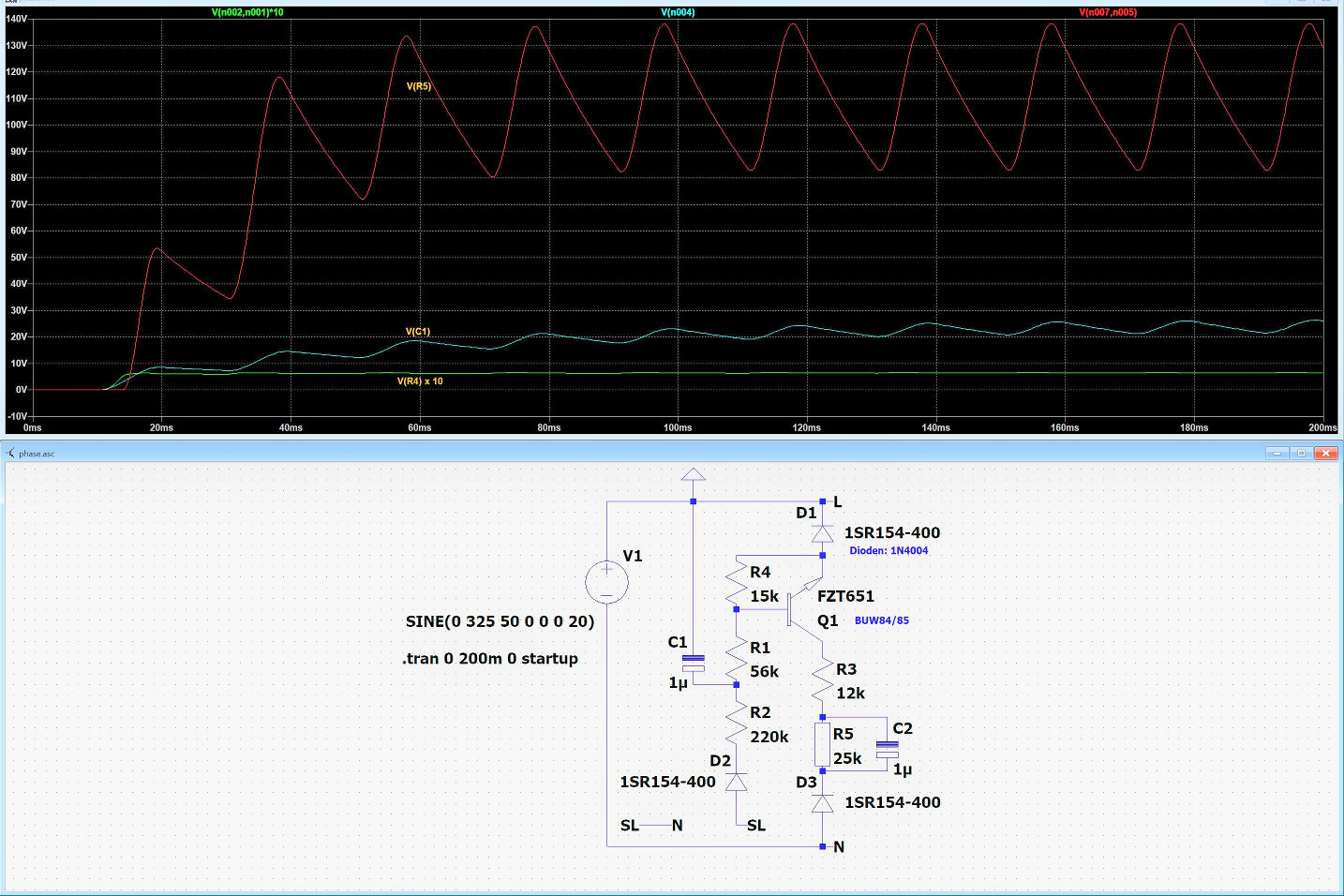 Die vorstehende Schaltung ist für Wechselspannung 230 V~ an Schuko-Steckdosen bestimmt und detektiert, ob am Anschluß L eine Phase anliegt oder nicht. Dazu wird der Schutzleiter SL benutzt, der ja vor einem FI-Schutzschalter mit dem Neutralleiter N und Erdpotential verbunden ist. Wenn also an Anschluß L kein Phasenpotential ist, ist hier Schutzleiterpotential, wodurch praktisch 0 V an der Ansteuerstrecke des Transistors anliegt.