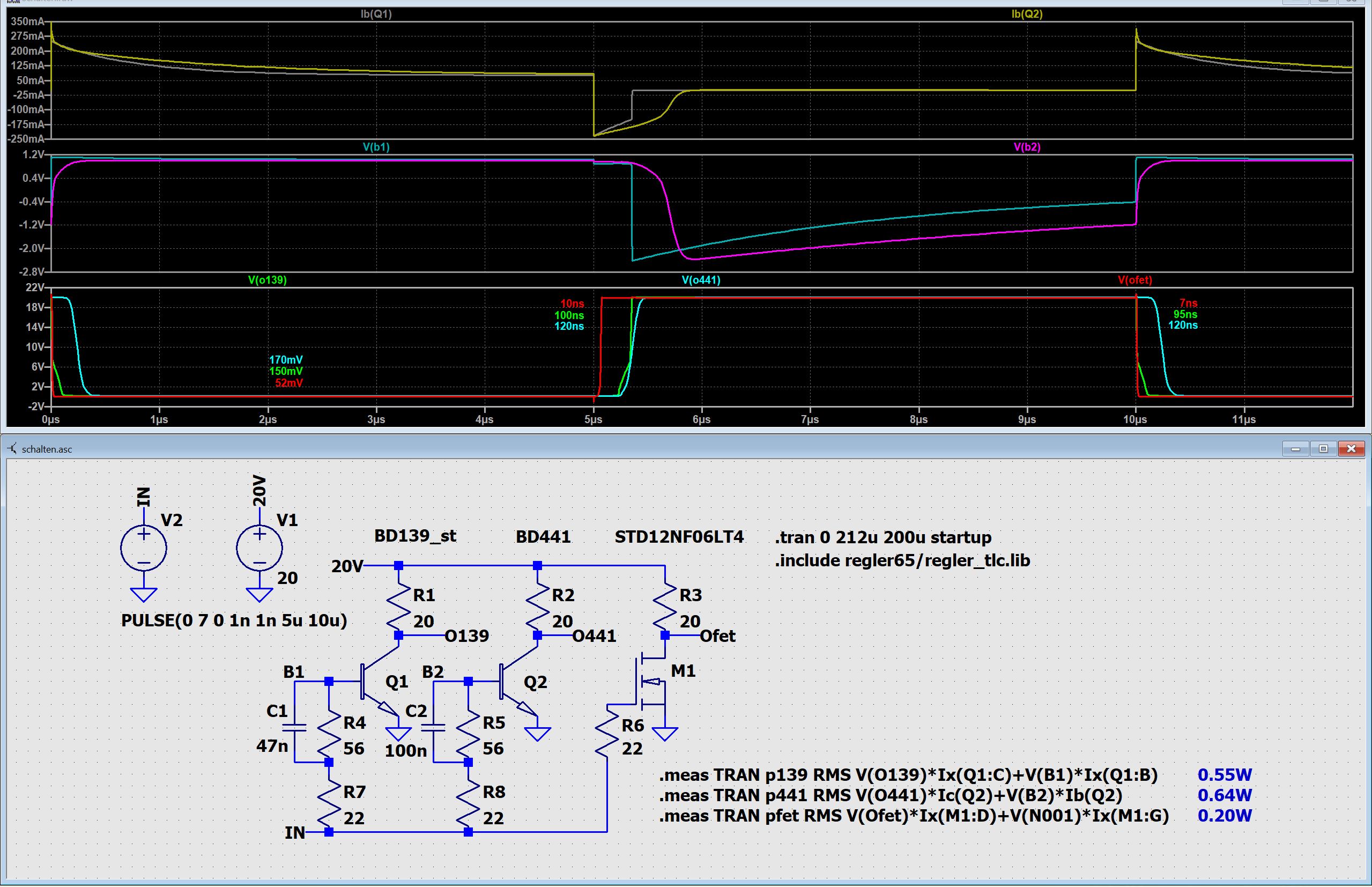 ^Ein sehr guter bipolarer Transistor FZT651 wurde hinzugefügt. Dazu sind keine Diagramm-Bilder vorhanden. Dessen Flankenzeiten sind sehr klein. Die Verzögerungszeiten sind wie bei den BDXXX. C2 konnte hier auf 47 nF reduziert werden. Der Spannungsverlauf am Ausgang ist rechteckig wie beim MOSFET. Der MOSFET hat dennoch die geringste Verlustleistung, wegen seiner geringen Sättigungsspannung. Weiterhin fällt er mit seinen sehr geringen Verzögerungszeiten auf.