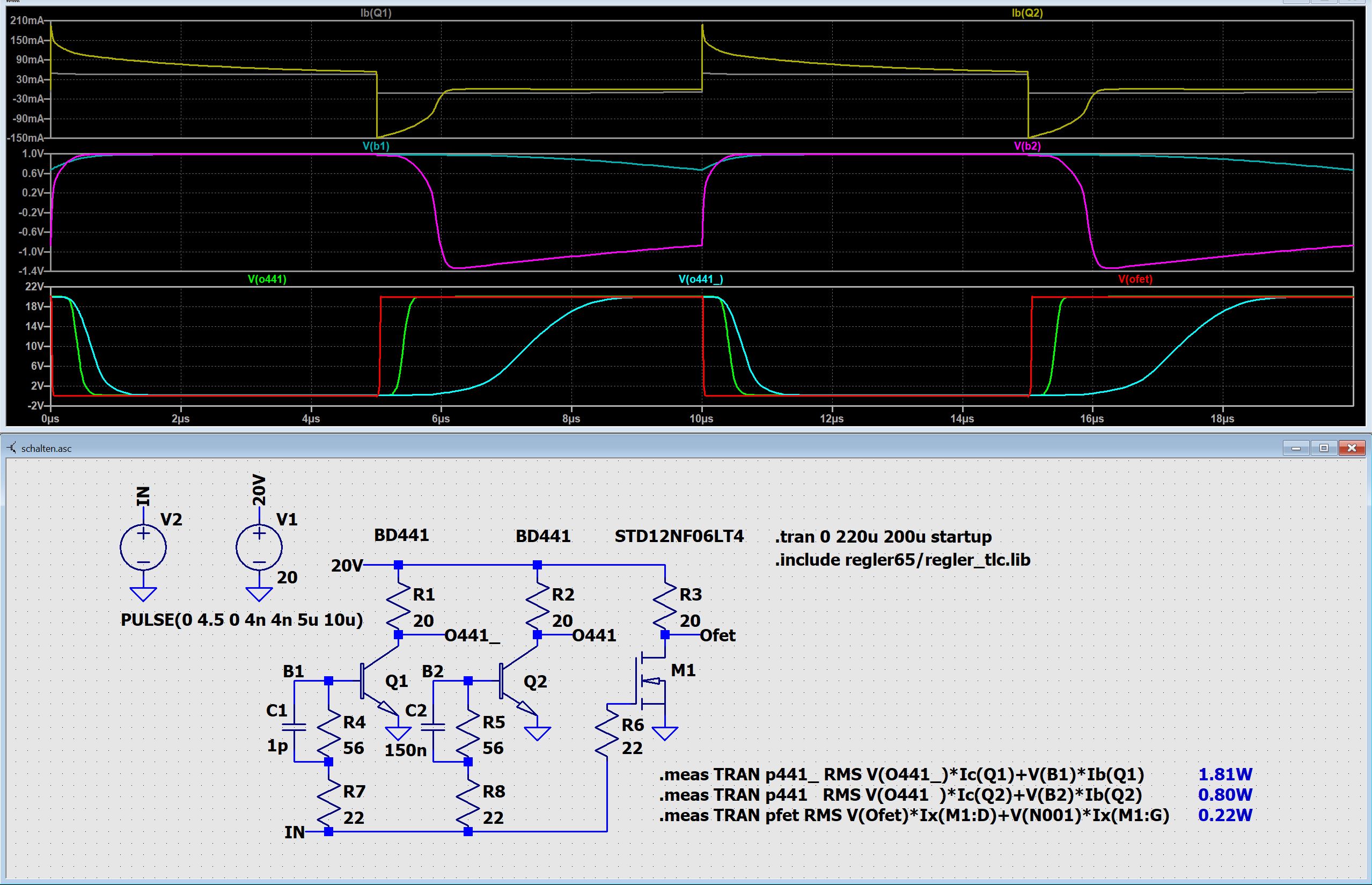Der Transistor BD441 wurde ohne (1 pF) und mit (150 nF) Beschleunigungskondensator verglichen. Die Wirkung ist gewaltig, wie die Kurvendiagramme und die Verlustleistungen (rechts unten) zeigen. Die Widerstandswerte blieben unverändert. Verändert wurden die Puls-Spannung 7 V → 4.5 V und die Flankenzeiten 1 ns → 4 ns, um zu demonstrieren, daß der MOSFET auch mit deutlich geringeren Gate-Spannungen voll und schnell durchsteuert. Ein Rg = 330 R ändert nicht viel daran. Bewirkt dadurch, daß der MOSFET eine geringe Gate-Schwellwertspannung von typ. 1,5 V und eine hohe Steilheit von etwa 17 A/V hat. Die Gate-Kapazität beträgt lediglich 350 pF.