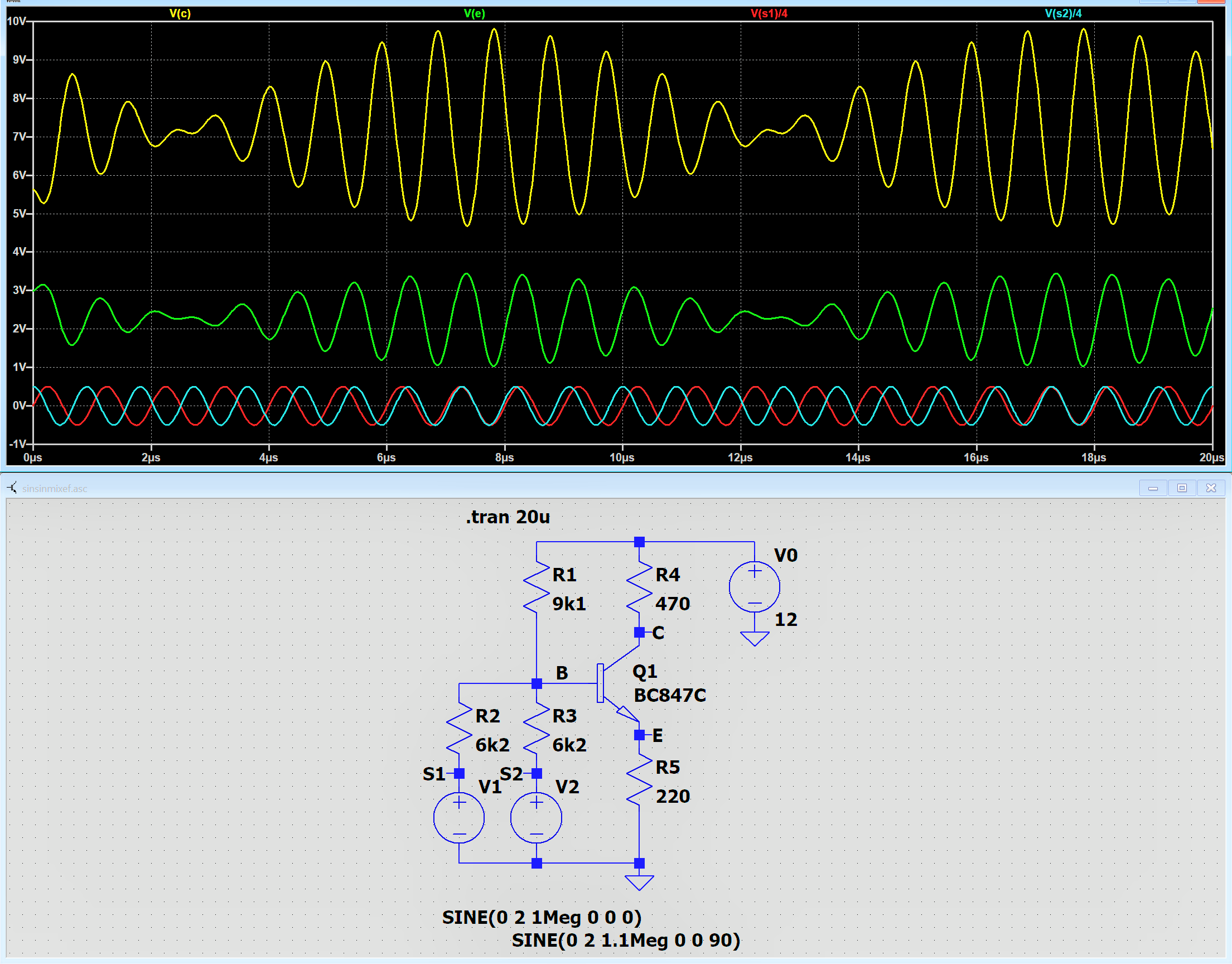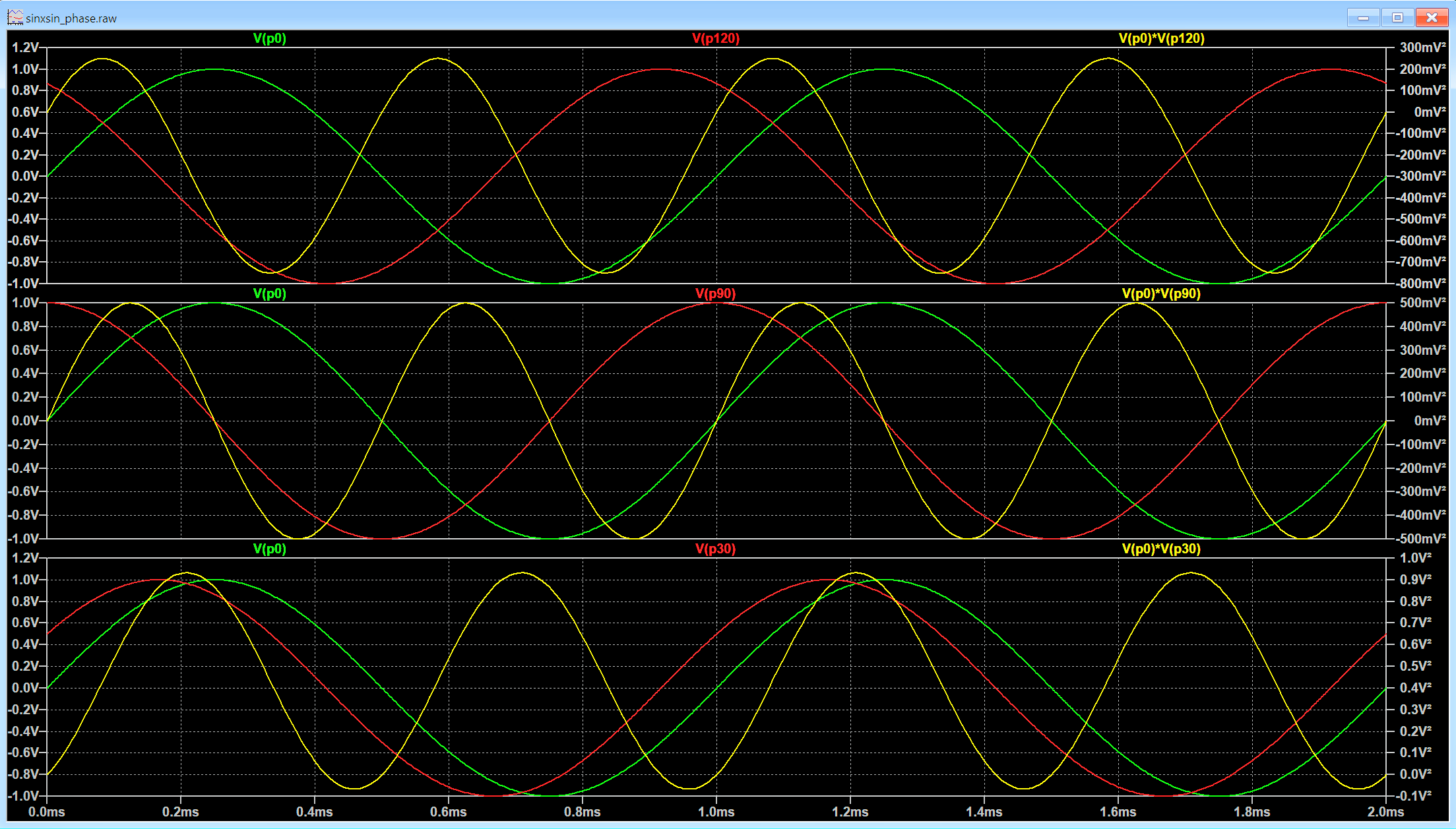 Vorstehend werden je zwei Sinus-Signale grün und rot mit gleicher Frequenz multiplikativ verknüpft (gelb). Die Phasenverschiebungen zwischen grün und rot betragen 120, 90 und 30 Grad. In allen Fällen hat die resultierende Mischspannung (gelb) die doppelte Frequenz (f1+f2). Bei 90° ist die Mischspannung symmetrisch um die 0-Linie herum. Bei 120° hat die Mischspannung einen negativen DC-Offset, bei 30° einen positiven DC-Offset. Die vertikalen Skalen rechts zeigen dies.