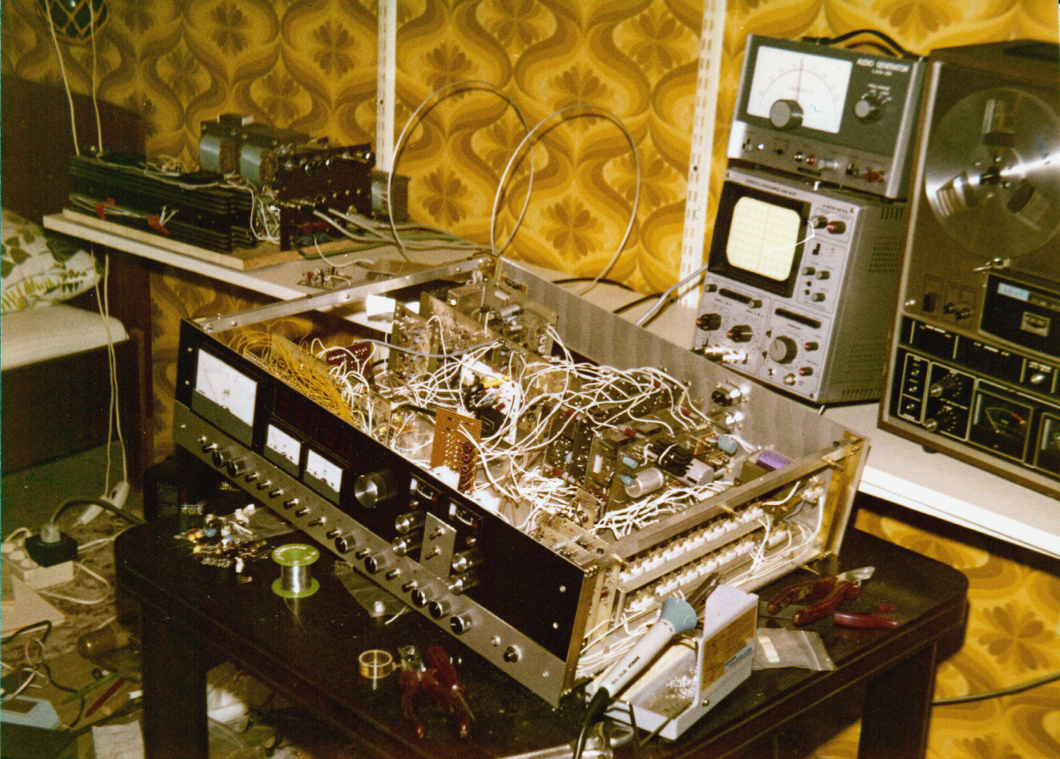 Im Hintergrund ist ein selbst gebauter Audio‑Verstärker